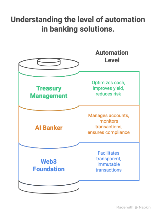 AI Banker – Banqer (codenamed Rishika): Your Robo-Helper: At the heart of YYOB is an AI Banker, envisioned as "your own robot banker" and "a treasury's robo helper". This AI is informed about all regulations for cash management, manages access to bank accounts, monitors transactions for anomalies, and performs critical tasks such as payment operations, payment compliance, and balances and transactions monitoring. The long-term vision is that AI will fundamentally become the bank of the future, with the view that "In 2030 AI will be your bank". This AI, named Rishika, aims to be "an AI with a degree in banking with blockchain as its system of record and zero tolerance for inefficiencies".